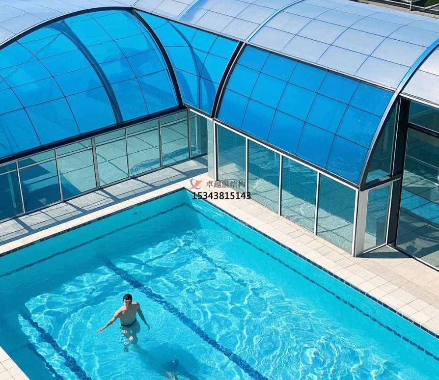 泳池膜結(jié)構(gòu),是一種將膜材料與支撐結(jié)構(gòu)相結(jié)合,用于覆蓋和圍護泳池空間的建筑形式。膜材料通常采用高強度、耐候性好的聚酯纖維基布,表面涂覆聚氯乙烯(PVC)或聚偏氟乙烯(PVDF)等涂層,賦予膜材良好的防水、抗紫外線、自潔等性能。支撐結(jié)構(gòu)則可根據(jù)不同的設(shè)計需求,選用鋼結(jié)構(gòu)、鋁合金結(jié)構(gòu)或索結(jié)構(gòu)等,為膜材提供穩(wěn)定的支撐。