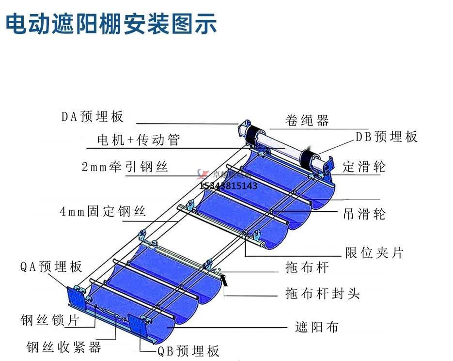 幼兒園FCS折疊遮陽(yáng)天棚即使用管狀電機(jī),利用鋼絲循環(huán)運(yùn)動(dòng),從而帶動(dòng)面料收放,達(dá)到遮陽(yáng)的效果。FCS折疊遮陽(yáng)天棚機(jī)構(gòu)分為傳動(dòng)和面料兩大部分:上方傳動(dòng)部分的另一端為動(dòng)力端,利用管狀電機(jī)旋轉(zhuǎn)帶動(dòng)卷管及固定在卷管上的卷繩器旋轉(zhuǎn)從而是一根鋼絲繩進(jìn)行收放。傳動(dòng)部分的另一端為滑輪鋼絲通過(guò)滑輪進(jìn)行換向,使一根鋼絲的兩端能同時(shí)固定卷繩器上,并且鋼絲始終保持繃緊。面料部分的上半部分是一根兩端固定并繃緊的鋼絲(天棚簾跨度過(guò)大的改用滑動(dòng)門軌),下半部分為面料,面料從頂端開始安裝牽引桿,間距等分(通常為0.8米左右)。牽引桿上安裝流動(dòng)滑輪,滑輪在固定在鋼絲上運(yùn)行。第一根牽引桿與傳動(dòng)鋼絲連接,在電機(jī)固定鋼絲展開與收攏。