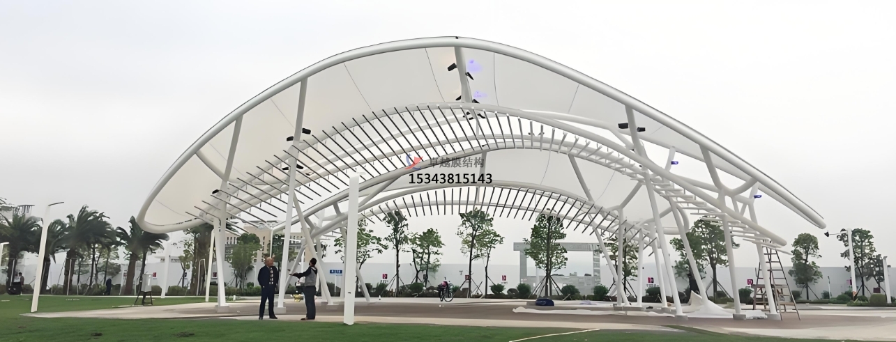 在實(shí)際應(yīng)用方面,景觀膜結(jié)構(gòu)的身影遍布各個(gè)領(lǐng)域。在城市公園與廣場,它常被用于搭建遮陽避雨的設(shè)施,如長廊、亭子等。這些膜結(jié)構(gòu)設(shè)施不僅為市民提供了舒適的休閑空間,讓人們在戶外活動(dòng)時(shí)免受日曬雨淋,其獨(dú)特的造型和光影效果,還為公園增添了濃厚的藝術(shù)氛圍,成為人們拍照打卡的熱門地點(diǎn)。在體育場館,大型的膜結(jié)構(gòu)屋頂和看臺(tái)設(shè)計(jì)屢見不鮮。膜結(jié)構(gòu)減輕了建筑自重,提高了場館的抗震性能,在舉辦賽事時(shí),獨(dú)特的膜結(jié)構(gòu)造型配合燈光效果,能夠營造出熱烈而獨(dú)特的觀賽氛圍,增強(qiáng)觀眾的觀賽體驗(yàn)。商業(yè)街區(qū)和步行街也廣泛應(yīng)用景觀膜結(jié)構(gòu),可作為臨時(shí)的商業(yè)展示空間,或是裝飾性的建筑元素,吸引顧客的注意力,提升商業(yè)空間的品質(zhì)和吸引力,促進(jìn)商業(yè)活動(dòng)的開展。
