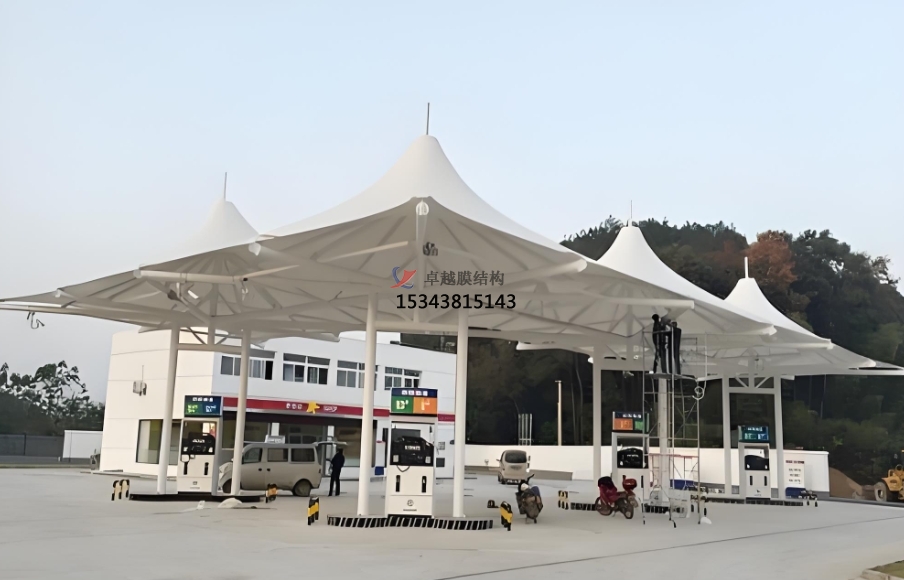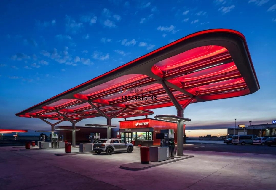 支 撐系統(tǒng)則根據加油站的規(guī)模和設計需求,選用鋼結構或鋁合金結構。鋼結構支撐具有較高的強度和穩(wěn)定性,能夠適應各種復雜的地形和氣候條件,通過合理的力學設計,將膜材所承受的荷載均勻傳遞至基礎。鋁合金結構則以其輕質、耐腐蝕的特點,在一些對重量有嚴格要求或環(huán)境較為惡劣的地區(qū)備受青睞,減輕了基礎的承載壓力,同時降低了維護成本。