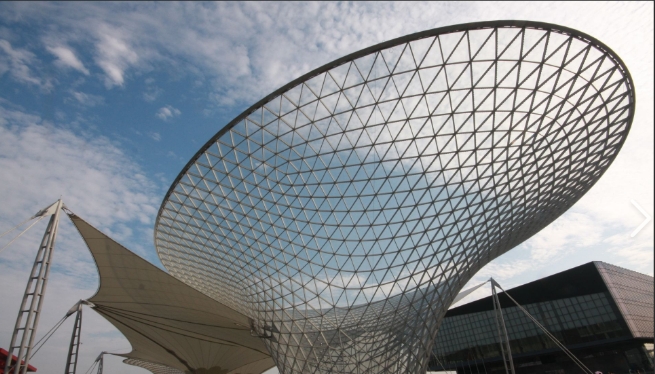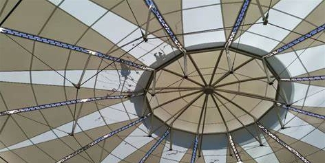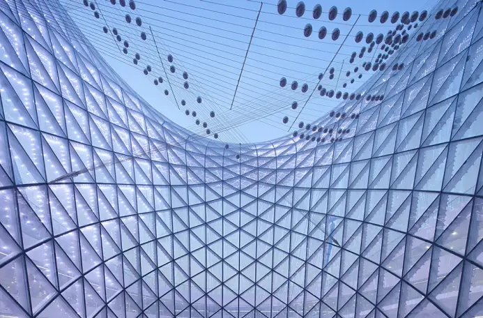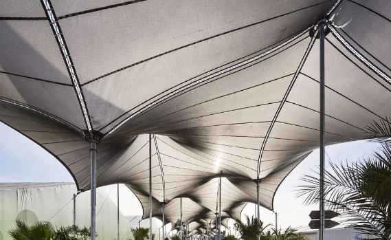 索膜結(jié)構(gòu)建筑應(yīng)用場景:其應(yīng)用場景廣泛,可在體育場館、展覽中心、機(jī)場航站樓、景觀建筑、商業(yè)建筑等領(lǐng)域內(nèi)使用。在體育場中,館如北京的國家體育場“鳥巢”,其設(shè)計靈感源于索膜結(jié)構(gòu)思想,索膜結(jié)構(gòu)可為體育場館提供大跨度無柱空間,滿足觀眾視線和賽事功能需求。在展覽中心能夠提供寬敞明亮的無柱展覽空間,便于展品布置和人流疏散,同時自然采光也能提升展覽效果。在機(jī)場航站樓可創(chuàng)造出開闊的候機(jī)和交通空間,使旅客能清晰地看到機(jī)場的布局和指示標(biāo)志,膜材的透光性還能讓室內(nèi)空間更加舒適。景觀建筑領(lǐng)域,可在公園、廣場等場所,可設(shè)計成各種造型的景觀小品、遮陽設(shè)施等,為城市增添特色和藝術(shù)氛圍。在商業(yè)建筑中,如商業(yè)街、購物中心的入口、屋頂或中庭等部位,可采用索膜結(jié)構(gòu)來吸引顧客,營造獨特的商業(yè)氛圍。