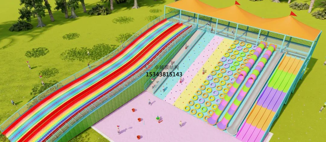 長治彩虹滑道新款張拉膜頂設(shè)計是一種創(chuàng)新的滑道設(shè)計,它采用了張拉膜結(jié)構(gòu)作為滑道的頂部,這種結(jié)構(gòu)不僅美觀,而且具有很好的遮陽和防雨效果。彩虹滑道是一種具有多彩顏色的滑道,游客可以乘坐橡皮艇在滑道上滑行,享受刺激和樂趣。