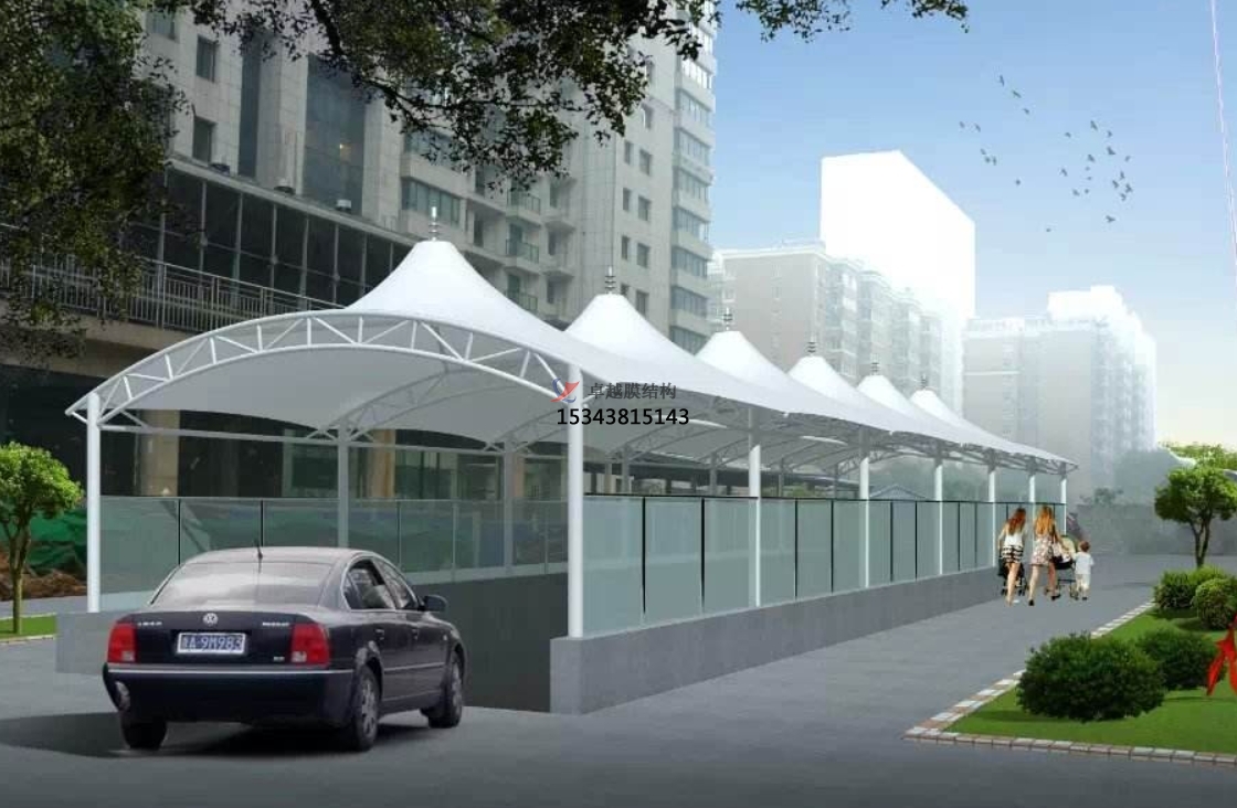 車庫(kù)出入口膜結(jié)構(gòu)頂棚是一種現(xiàn)代化的建筑結(jié)構(gòu),它采用高強(qiáng)度、耐久性的膜材料,通過(guò)鋼骨架、拉索、張力桿等構(gòu)件,形成一種穩(wěn)定的空間形態(tài),用于車庫(kù)出入口的遮陽(yáng)和防護(hù)。這種結(jié)構(gòu)不僅具有良好的透光性和抗風(fēng)能力,而且設(shè)計(jì)簡(jiǎn)潔美觀,非常有現(xiàn)代感。