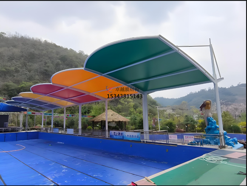 案例 :膜結(jié)構(gòu)遮陽棚采用PVC/PVDF材質(zhì),顏色豐富(如橙色、藍色),與綠植形成對比,提升公園藝術(shù)性‌。