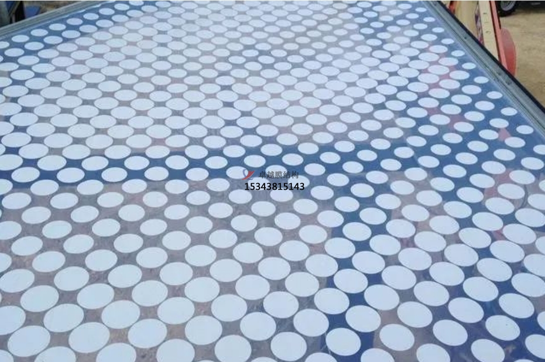 ETFE薄膜不僅具有優(yōu)良的抗沖擊性能,熱穩(wěn)定性能及耐候性,自清潔性,耐化學腐蝕性能,且重量只有同等面積玻璃的1%。  印刷ETFE膜材最常用的圖案是圓形銀點,由于銀對太陽輻射的反射,印刷面積的百分比根據(jù)太陽熱增益因子的要求進行評估。