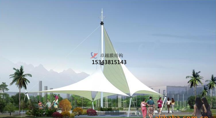 2.標志性小品 一個城市的中心區(qū)反映一個城市的地輿面貌和民族風情,一起,也是一個城市文化開展程度的標志。而景象設(shè)計要求其具有廣泛的可讀性、老少皆宜,既有超凡脫俗的藝術(shù)價值,又能使群眾膾炙人口與群眾息息相通。膜結(jié)構(gòu)以其鮮明的特性和標識性,使用于城市小品設(shè)計中。