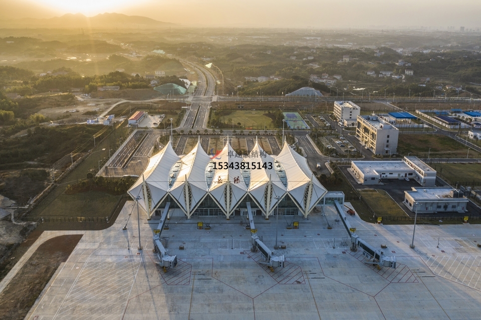 航站樓創(chuàng)新性地采用PTFE拉膜結(jié)構(gòu)體系創(chuàng)造出具有獨(dú)一無二的現(xiàn)代航空港造型,鋼結(jié)構(gòu)梭柱與白色拉膜的組合將岳陽的傳統(tǒng)景點(diǎn)——瀟湘八景之一:“遠(yuǎn)浦歸帆”的意境以現(xiàn)代的方式重新演繹,體現(xiàn)濃郁的現(xiàn)代氣息的同時(shí)又延續(xù)了傳統(tǒng)地域文化。