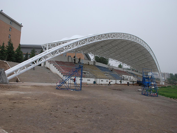 由于膜材的光透性,白天陽光可以透過膜材形成慢射光,使室內(nèi)達(dá)到和室外幾乎一樣的自然效果,因此膜結(jié)構(gòu)能創(chuàng)造出與自然環(huán)境相媲美的空間形式。體育場看臺(tái)采用膜結(jié)構(gòu)的設(shè)計(jì),膜結(jié)構(gòu)的張拉樣式無形當(dāng)中增大了空間跨度,輕輕松松的將整個(gè)的看臺(tái)處被覆蓋,在簡化了建筑結(jié)構(gòu)的同時(shí)建筑重量也輕松很多,讓施工更簡便,還降低了施工工人的危險(xiǎn)系數(shù),縮短了工程的建造工期。