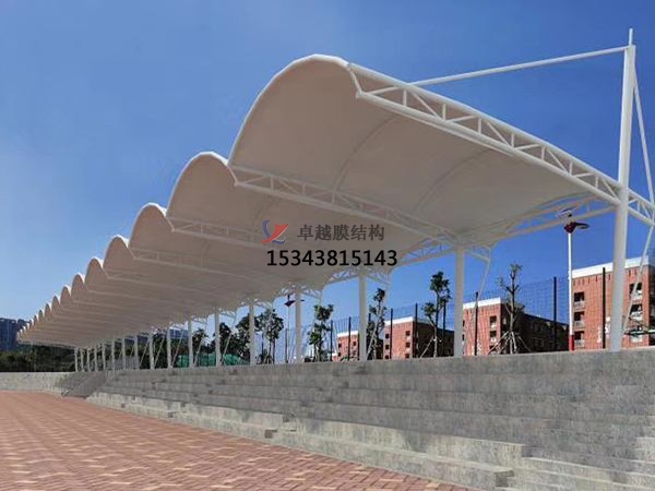 另外,膜材料的表面污染程度還與屋頂?shù)膬A斜角度有很大的關(guān)系,一般屋頂與水平面的角度越大越 容易變臟。傾斜角在0°~45°范圍之內(nèi)不易產(chǎn)生雨水痕跡,當(dāng)傾斜角超過65°時會出現(xiàn)雨水痕跡。一般膜結(jié)構(gòu)的側(cè)面多為90°,在使用過程中很難避免造成雨水痕跡。對膜材料自潔性的評價,是將 膜材料進行室外暴曬試驗,然后用分光光度計測量暴曬前及暴曬后膜材料的可見光反射率,用得出 的色差(△E)來進行評價。色差越小表示其自潔性越好。 自潔性膜結(jié)構(gòu)建筑不論是用于永jiu性建筑還是用于臨時性建筑,都要求使用的膜材料具有 自潔性,能保持建筑的美觀。