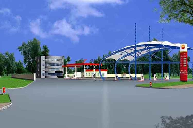 二、加油站頂棚并不是傳統(tǒng)意義上的一個(gè)遮陽(yáng)擋雨的覆蓋頂棚,隨著人們審美的不斷提高,除了要求頂棚具有實(shí)用性功能外,還要有一定的美觀性,因此,在充分發(fā)揮膜布的性能條件下,搭配先進(jìn)的張拉技術(shù),可以將頂棚張拉成不同的形狀,使加油站更具有藝術(shù)美感。