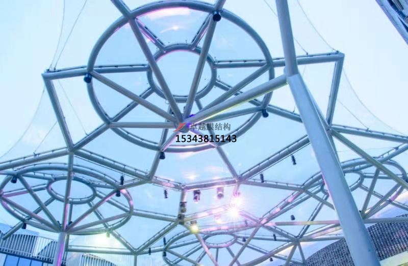 膜結(jié)構(gòu)以高強(qiáng)度柔性薄膜(如ETFE、PVDF)為核心材料,結(jié)合鋼索、桁架等支撐體系,形成兼具輕量化與高穩(wěn)定性的空間曲面12。其自重僅為傳統(tǒng)鋼構(gòu)的1/3,大幅降低基礎(chǔ)造價,同時支持50米以上無柱大跨度設(shè)計,為商業(yè)廣場創(chuàng)造開闊通透的公共空間。ETFE氣枕膜通過多層鍍點設(shè)計,可智能調(diào)節(jié)透光率與紫外線過濾效率,例如嘉興長安里商業(yè)街的天幕結(jié)構(gòu),既能實現(xiàn)光線漫射營造柔和氛圍,又能有效阻隔70%以上的紫外線輻射。