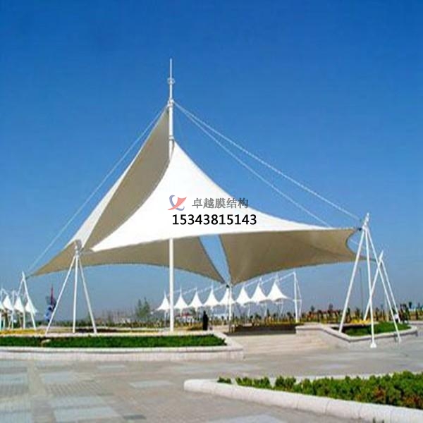 膜結(jié)構(gòu)景觀的篷布采用PVC/PVDF/PTFE/ETFE,而膜材的特點(diǎn)是強(qiáng)度高、耐久性好、防火難燃、自潔性好,不受紫外線影響,使用壽命長,一般15-30年。具有高透光率,透光率為13%,對熱能反射率73%,熱吸收量很少。正是因為這種劃時代的膜材料的發(fā)明,使膜結(jié)構(gòu)景觀成為現(xiàn)代化的建筑。