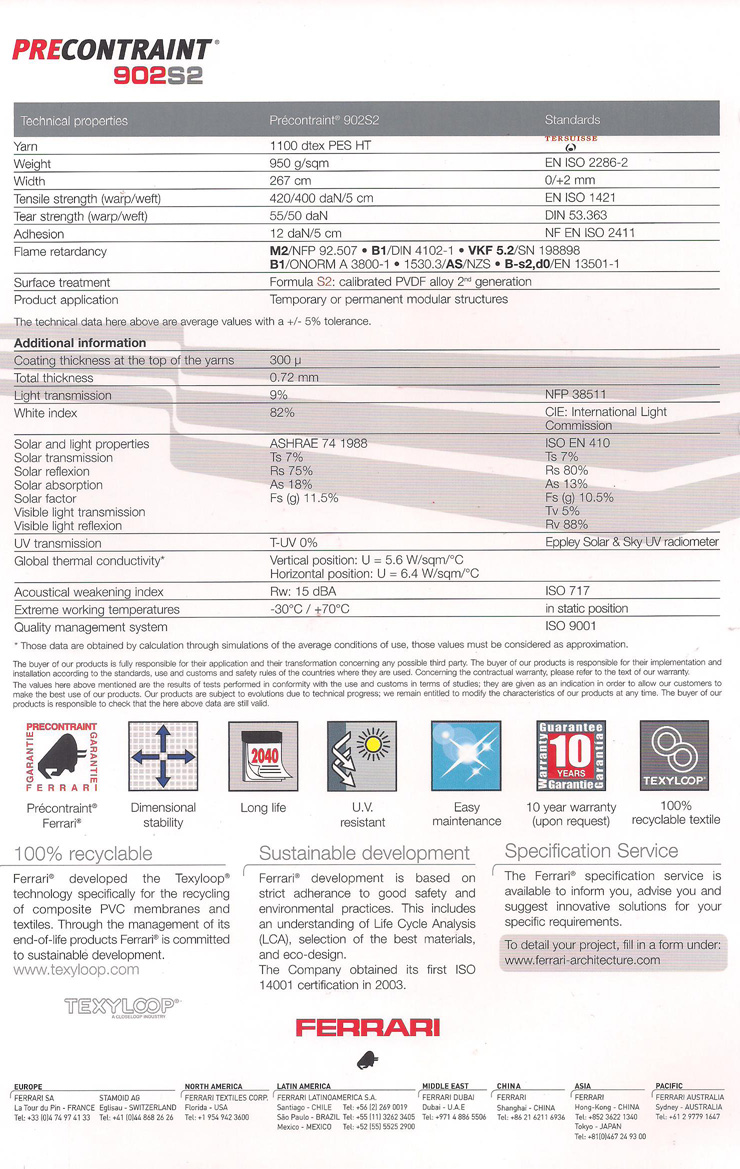 法拉利膜材十多年來,法拉利(PVDF)表面處理的復(fù)合膜材被應(yīng)用在全世界重要的織物建筑工程中?,F(xiàn)在,第代膜材再次確認(rèn)了這一出眾材料性能的更新發(fā)展。法拉利研發(fā)了第代材料正是為了滿足建筑師和業(yè)主在新世紀(jì)之初對(duì)于織物建筑提出的要求。這一 全新的膜材得益于更新的科研技術(shù),即將PVDF和硬化介體完美地結(jié)合。這種特殊的結(jié)合明顯地提高了材料的機(jī)械強(qiáng)度、使用壽命,并能長期保持織物建筑的原始 美觀。第代膜材在積累了10多年的經(jīng)驗(yàn)的基礎(chǔ)上,可以提供專業(yè)保證。法拉利現(xiàn)在能夠根據(jù)要求和每個(gè)項(xiàng)目的具體情況,提供12年質(zhì)量保證 (PRECONTRAINT702除外)。