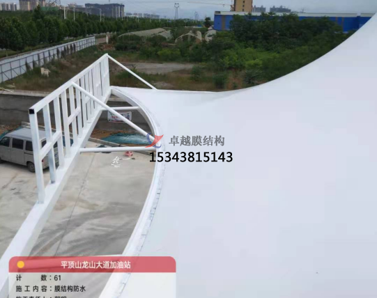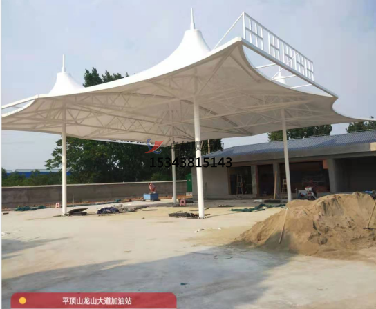 該項(xiàng)目位于平頂山汝州市龍山大道,由中石油直營(yíng),采用骨架式弧形軟邊張拉膜,設(shè)計(jì)壽命15年,膜材采用PVDF5000N 建筑膜材,完工時(shí)間2021年6月10日