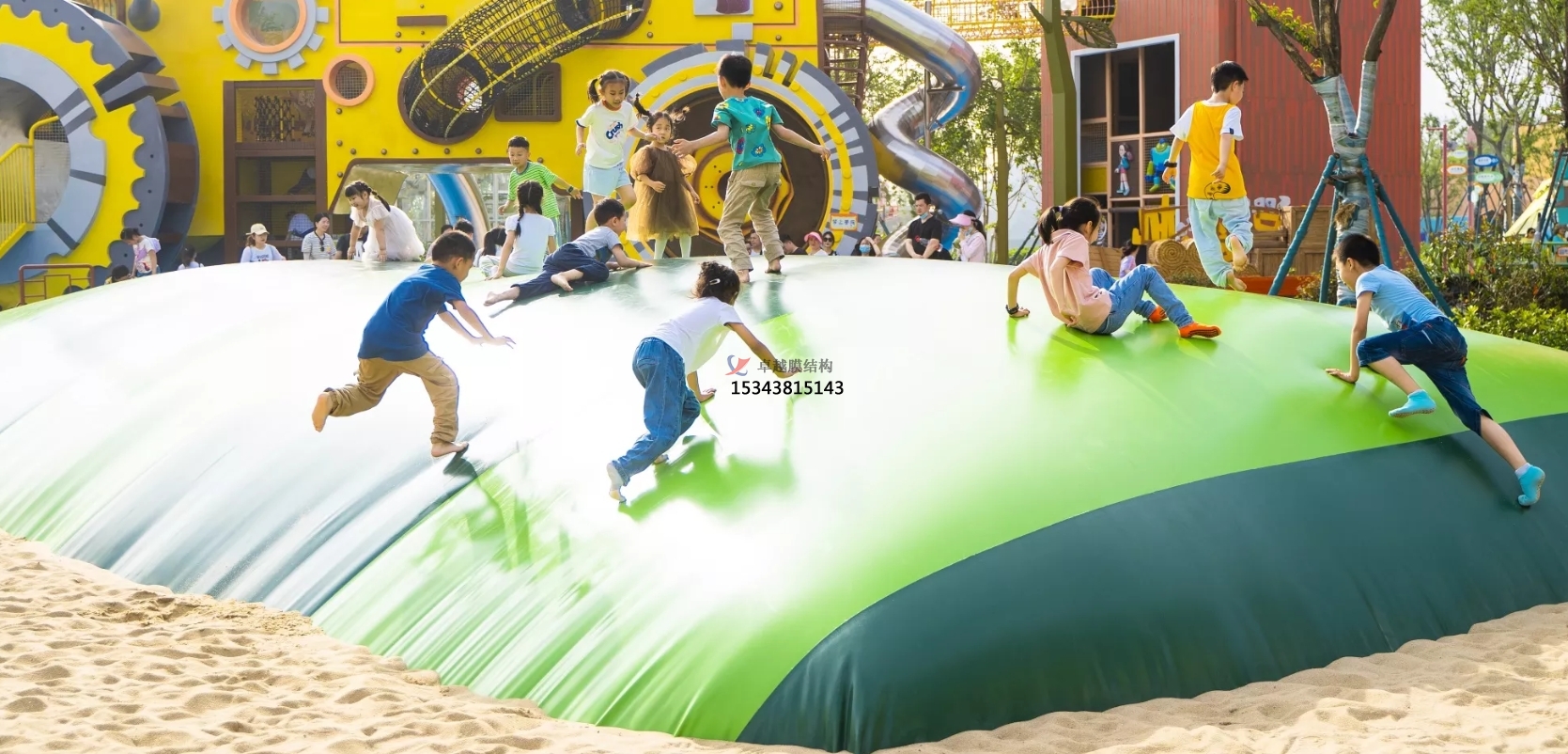 雙層膜結(jié)構(gòu):蹦蹦云采用雙層膜結(jié)構(gòu),外層膜與內(nèi)層膜協(xié)同工作。外膜直接接觸外界環(huán)境與游客,承擔(dān)著主要的耐磨、抗紫外線以及自潔功能。它選用的是高強(qiáng)度膜材,如進(jìn)口 pvdf 材質(zhì),這種材料極為耐磨,能承受大量游客長期頻繁的踩踏。同時,其出色的抗紫外線性能,使得蹦蹦云即使長時間在烈日下暴曬,也不會出現(xiàn)褪色、老化等問題,保證了設(shè)施的長期使用。