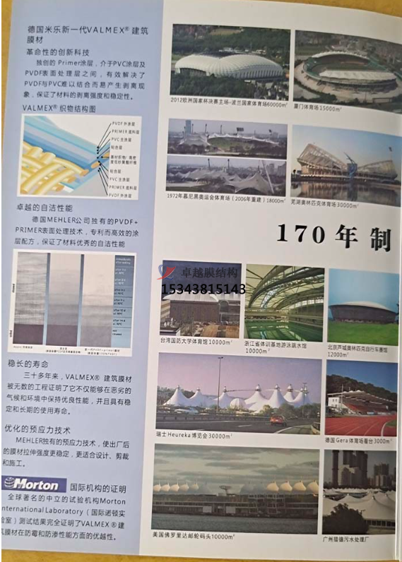 德國MEHLERHAKU米樂公司擁有165年(1837年一2003年)的制造業(yè)經(jīng)驗(yàn)。通過1S09001質(zhì)量體系認(rèn)證,所有產(chǎn)品均經(jīng)過嚴(yán)格的DIN德國工業(yè)標(biāo)準(zhǔn),以及各個國家的膜材工業(yè)標(biāo)準(zhǔn)。2002年,德國米樂公司獲聘為中華人民共和國建設(shè)部《索膜建筑結(jié)構(gòu)制品》行業(yè)標(biāo)準(zhǔn)編制委員成員。德國米樂的產(chǎn)品系列涵蓋環(huán)保等各種PVC膜材領(lǐng)域,包括:建筑工程、輕型結(jié)構(gòu)、廣告、遮陽、汽艇、軍用、裝飾、水利環(huán)保,等等。