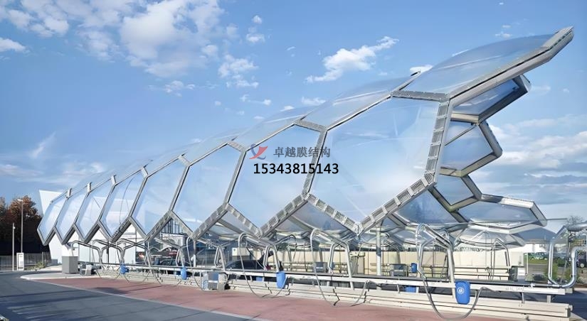 以下是膜結(jié)構(gòu)產(chǎn)品的主要應用和特點:‌膜結(jié)構(gòu)自行車棚和機動車棚,膜結(jié)構(gòu)景觀‌,‌膜結(jié)構(gòu)污水池加蓋,膜結(jié)構(gòu)體育場館和展會建筑‌,膜結(jié)構(gòu)藝術(shù)裝置‌,膜結(jié)構(gòu)充電樁和收費站‌。膜結(jié)構(gòu)自行車棚采用輕質(zhì)且堅固的膜材料,具備優(yōu)異的抗風、抗雨雪能力,同時具有自潔性,減少維護成本。其優(yōu)雅的造型和多樣的色彩選擇,使其成為城市中的一道靚麗風景線‌,而機動車棚的篷布采用PVC、PVDF、PTFE、ETFE等材料,具有高強度、耐久性好、防火難燃、自潔性強等特點。其透光率為13%,熱能反射率為73%,能有效減少熱吸收,使用壽命可達15-30年‌4。膜結(jié)構(gòu)景觀是一種耐用、高強度的涂層織物,具有柔韌的質(zhì)地、重量輕、透光性極佳等特點,常被用于公園、廣場等場所,成為吸引眼球的藝術(shù)景觀。隨著工業(yè)污染的加劇,膜結(jié)構(gòu)污水池加蓋因其環(huán)保、施工簡便等優(yōu)勢,逐漸成為工業(yè)污水處理的首選。其鋼材料使用量少,能有效解決池體跨度過大的施工難題‌。膜結(jié)構(gòu)在體育場館和展會建筑中的應用,不僅縮短了建設工期,降低了造價成本,還減少了環(huán)境污染。其大跨度的設計和高透光性,為場館提供了良好的采光和空間感。膜結(jié)構(gòu)藝術(shù)裝置設計簡單、造型獨特,不僅具有藝術(shù)展示效果,還能為人們提供休息場所,廣泛應用于公園、景區(qū)等場所。膜結(jié)構(gòu)充電樁和收費站以其耐用性和美觀性,成為現(xiàn)代城市基礎(chǔ)設施的重要組成部分,為人們提供便捷服務的同時,也大大提升了城市形象。