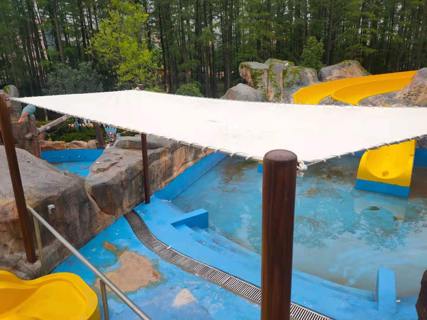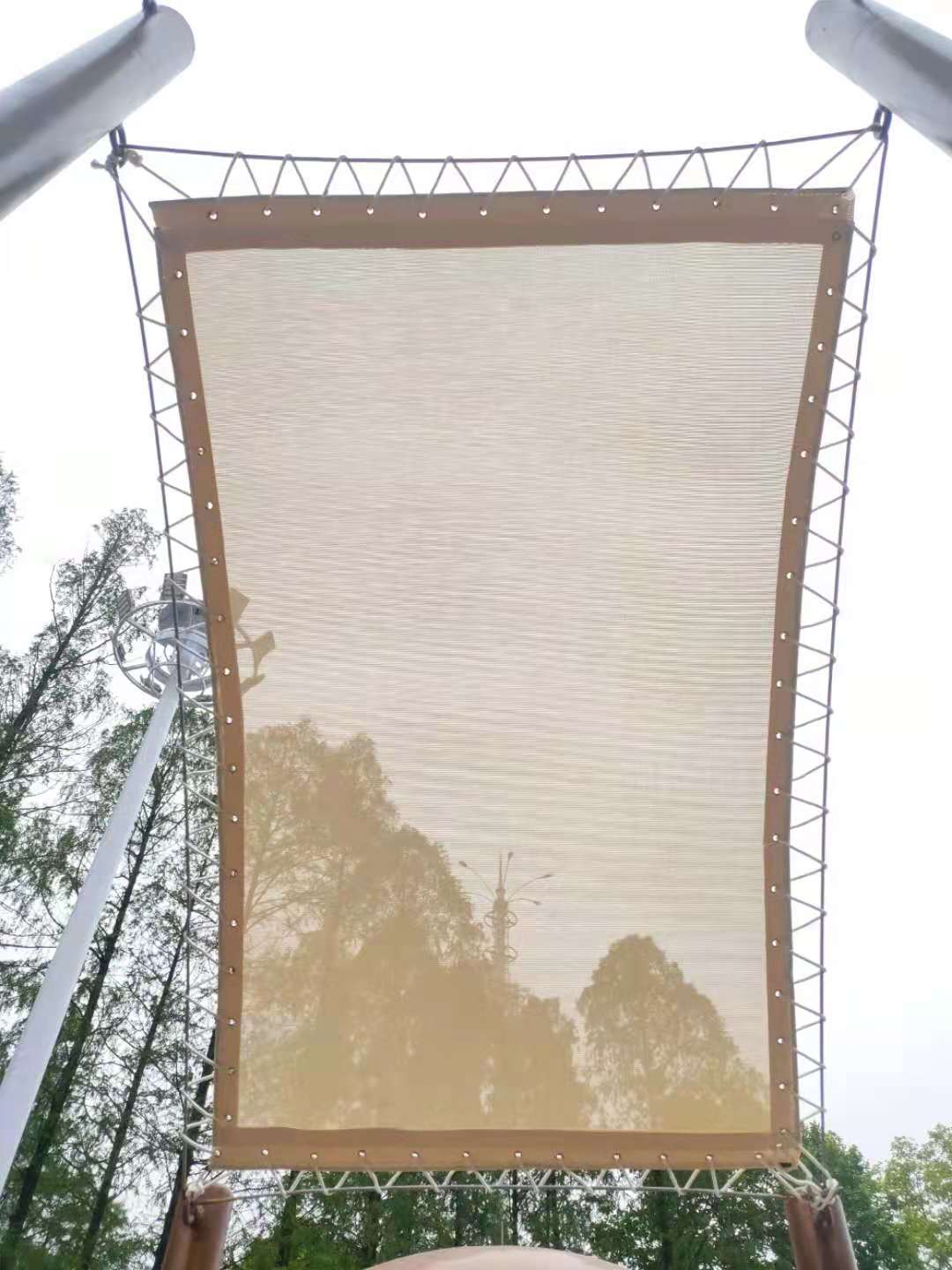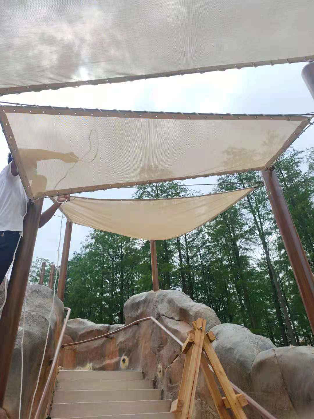 武漢瑪雅公園膜結(jié)構(gòu)景觀,是我公司與游樂設(shè)備公司配套工程,材料遮陽效果好,質(zhì)量輕,采用法國進(jìn)口彩色法拉利網(wǎng)格膜材,空運(yùn)到我廠深加工后,現(xiàn)場安裝完成的,完工時間2021年4月7日