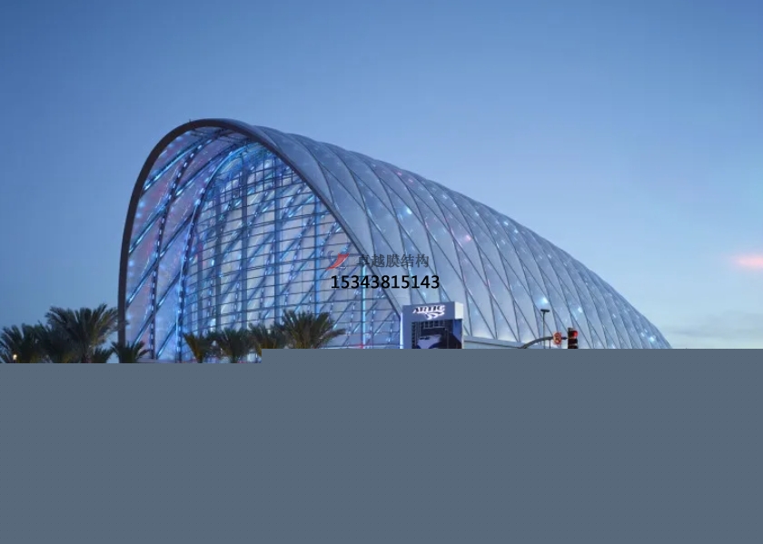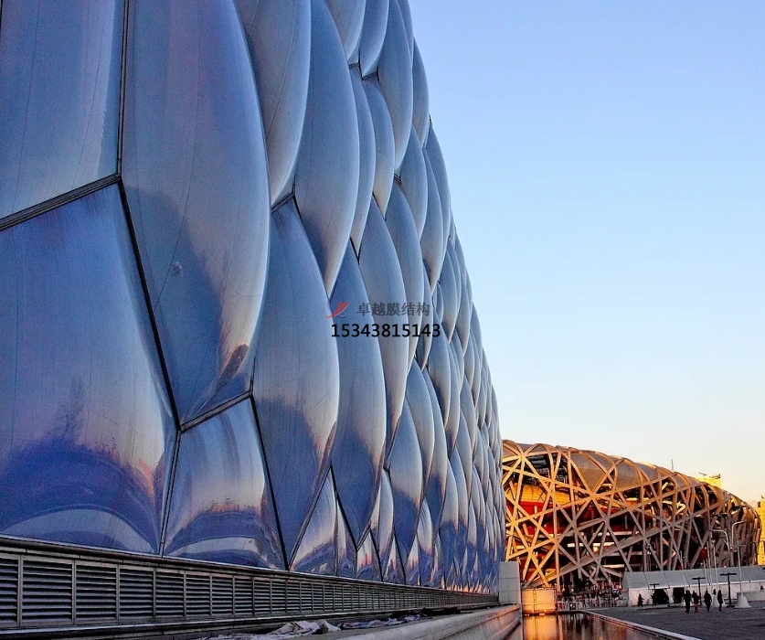 膜結(jié)構(gòu)使得建筑輕盈感十足,膜材料的良好透性使得建筑界面透光而不透視。由于該材料(ETFE)氣枕在陽光底下富有通透感光線可以通過漫射和折射進(jìn)入界面,讓膜結(jié)構(gòu)建筑呈現(xiàn)出朦朧夢(mèng)幻之美。