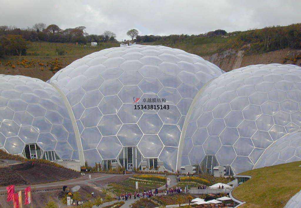“ETFE”是英文Ethylene Tetra Fluoro Ethylene的縮寫,中文名稱為乙烯-四氟乙烯共聚物。ETFE膜材具有較高的抗拉強度、抗沖擊強度及抗撕裂能力。ETFE膜材的厚度通常在0.05~0.25mm。隨著厚度的增加,膜材的硬度將增加,同時也更脆,增大了加工難度。ETFE材料的典型用法是,將兩層或三層膜材“焊接”在一起,運送到工地,然后充氣使它們膨脹成氣枕。