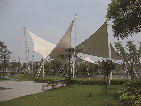 6、這是膜結(jié)構(gòu)景觀工程的案例,膜結(jié)構(gòu)所用的膜材本身具有良好的透光率,建筑空間白天可得到自然的漫射光,能節(jié)約大量照明能源;相對于傳統(tǒng)涂理PVC的聚醋纖維膜材,涂覆PTFE的玻瑞纖維膜材的透射光譜更加均勻具有外觀新穎,經(jīng)濟(jì)適用,適用壽命長,結(jié)構(gòu)更安全,質(zhì)量更可靠。