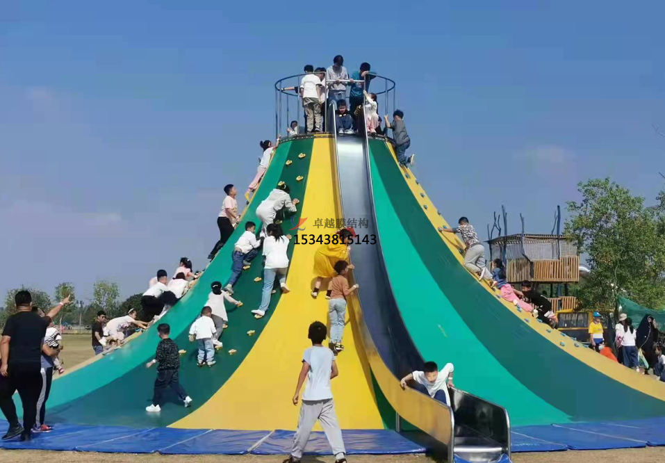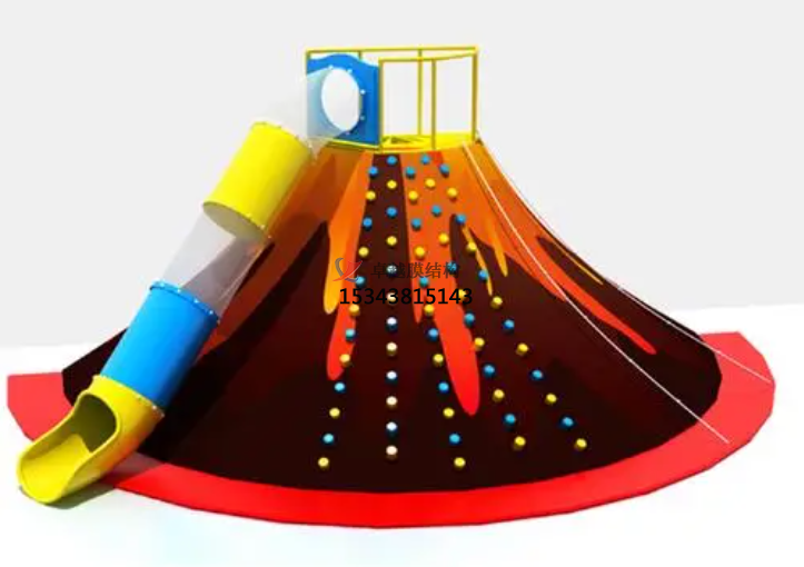 火山攀巖設(shè)備頂部可以設(shè)置滑梯,滑梯與膜結(jié)構(gòu)的火山造型相結(jié)合。當(dāng)游玩者從“火山”頂部通過(guò)滑梯滑下時(shí),滑梯自身的落差感,可以讓游玩者感受到從高處滑下過(guò)程中的興奮感和刺激感。膜結(jié)構(gòu)的存在為滑梯的設(shè)置提供了一種創(chuàng)意性的平臺(tái),使整個(gè)游樂(lè)體驗(yàn)更加豐富多樣。