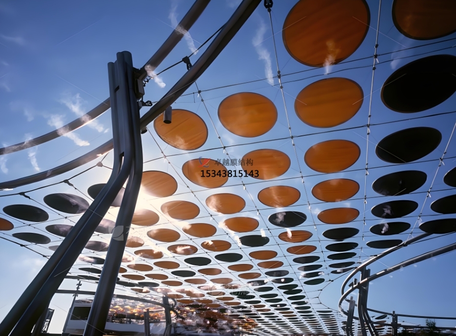 經(jīng)濟環(huán)保,綠色之選:在經(jīng)濟成本方面,景觀膜結(jié)構(gòu)施工過程簡便高效,工期相比傳統(tǒng)建筑大幅縮短。膜材與骨架在工廠預(yù)制完成后,現(xiàn)場只需進行快速組裝與連接,減少了施工周期內(nèi)的人力、物力投入。同時,其材料可回收利用率高,在結(jié)構(gòu)使用壽命結(jié)束后,大部分材料能回收再加工,降低了資源浪費與環(huán)境負擔(dān),符合當(dāng)下綠色建筑與可持續(xù)發(fā)展的理念,實現(xiàn)了經(jīng)濟效益與環(huán)保效益的雙贏。