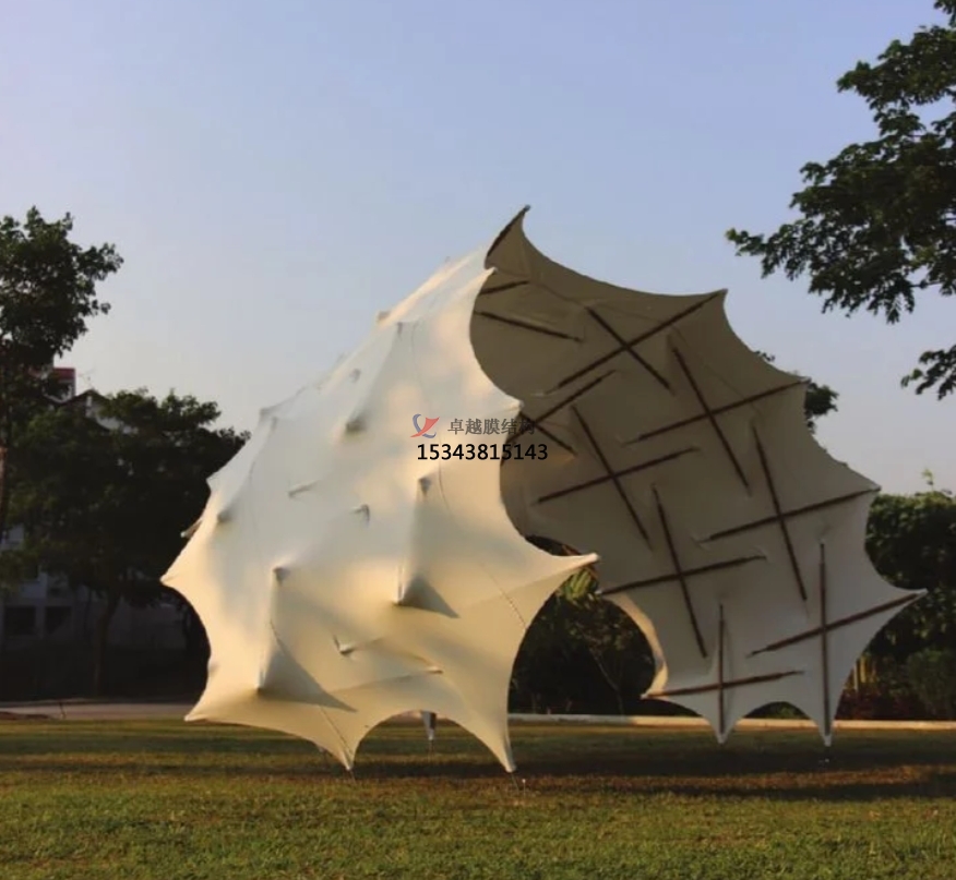 輕質(zhì)高強,穩(wěn)固耐用:景觀膜結(jié)構(gòu)采用的高強度薄膜材料,重量僅約為傳統(tǒng)建筑結(jié)構(gòu)材料的十分之一,極大地減輕了自身重量。但 “輕量級” 的它卻有著超乎想象的強大實力,拉伸強度極高,在面對風(fēng)荷載與雪荷載時,能憑借出色的韌性與剛性,展現(xiàn)卓越的穩(wěn)定性。在強風(fēng)天氣中,膜結(jié)構(gòu)可通過自身的柔性變形來緩沖風(fēng)力,避免因剛性抵抗而導(dǎo)致結(jié)構(gòu)損壞;面對積雪,其合理的造型與支撐設(shè)計能使積雪均勻分布或自然滑落,防止因積雪過重造成坍塌,為景觀設(shè)施提供可靠的安全保障。