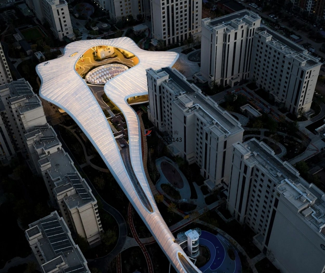 該半透明法拉利進(jìn)口PTFE膜材,遮陽防水,自然采光,既可以保證日間二層屋頂花園能夠有充分光照,夜間也可利用膜的反射來提供屋頂花園的照明功能需求。