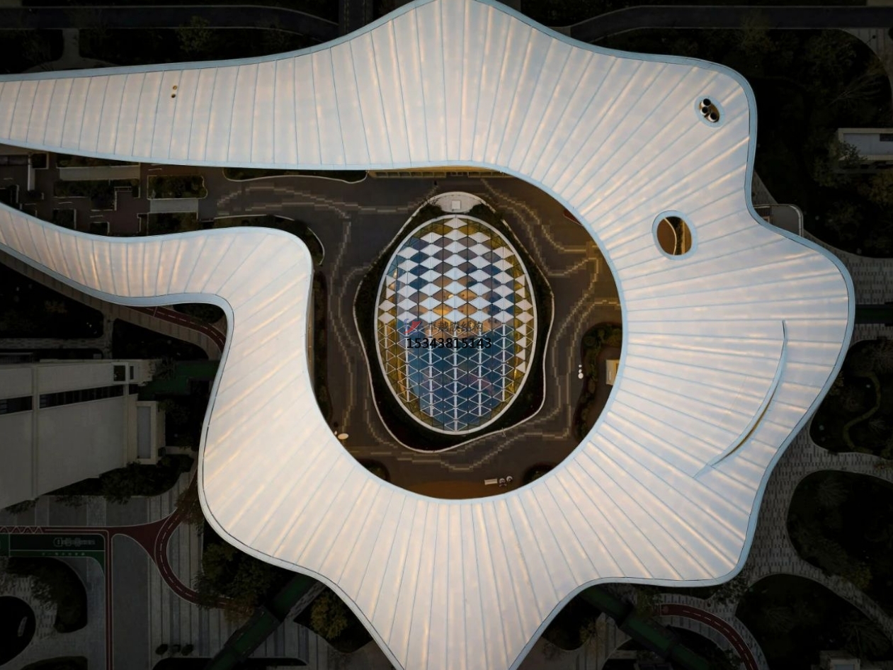 相對于四周規(guī)則的建筑形態(tài),活力中心呈現(xiàn)更加自由和充滿活力的有機形態(tài):如一顆水珠滴落,在場地中激起漣漪,自中心散開、升騰,形成一片白色、柔軟的云朵,最終轉(zhuǎn)化為自由的大屋頂。