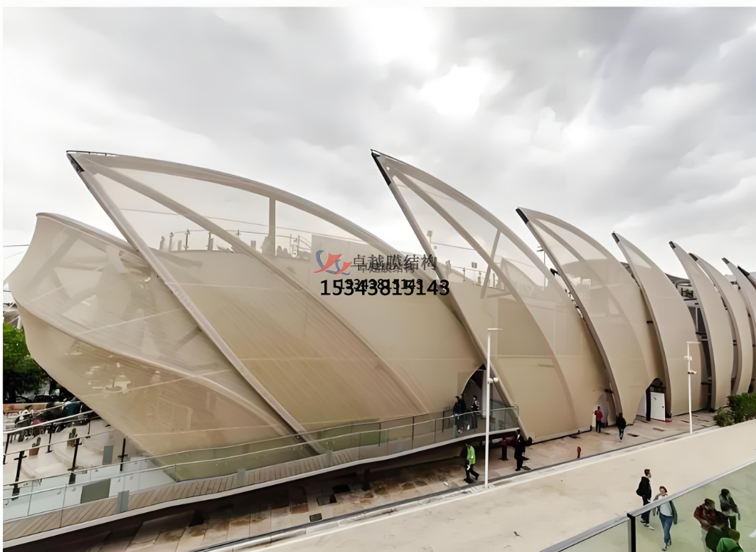 可塑性:膜材柔軟,可塑性強(qiáng),可以被拉伸成為各種動(dòng)態(tài)感強(qiáng)的形狀,配合膜結(jié)構(gòu)可以實(shí)現(xiàn)各種突破傳統(tǒng)模式的造型,創(chuàng)造大面積無柱覆蓋的空間。