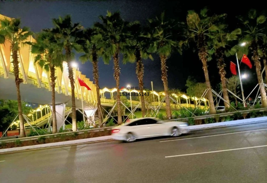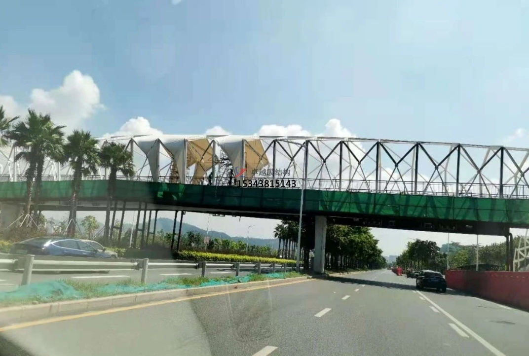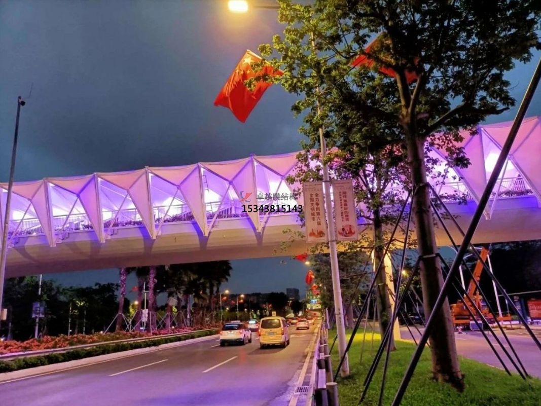 為了保質(zhì)、保量、保證工期、保安全的情況下順利的把項目交到業(yè)主手中,把施工人員分成兩班晝夜不分,日夜加班,還要克服現(xiàn)場的高溫,施工節(jié)點的困難,而且每片膜材的尺寸也不相同,為了膜材裁剪精準,設(shè)計師每跨每跨的量尺寸,又復(fù)合尺寸,確保了天橋立面膜結(jié)構(gòu)的安裝工程順利進行。