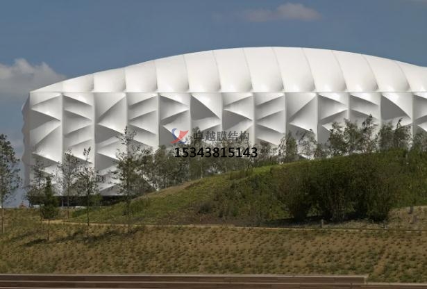 場(chǎng)館高30m,面積兩萬(wàn)平方米,外敷可收回PVC膜,膜在后面的結(jié)構(gòu)的效果下構(gòu)成美麗的崎嶇。透光的外表皮能夠使得場(chǎng)館在白天能夠十分少的依賴人工照明。