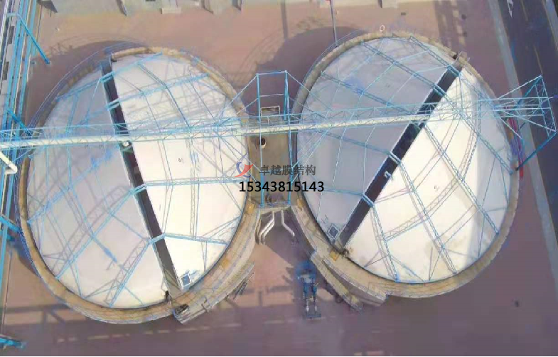 雙膜密封罩結(jié)構(gòu)是污水池上加蓋的一個(gè)氣囊,它由上下兩層氟碳纖維膜焊接而成,通過(guò)周邊與污水池池壁錨固,形成一個(gè)穩(wěn)定的受力結(jié)構(gòu),起到污水池內(nèi)惡臭氣體密閉的效果。雙膜密封罩結(jié)構(gòu)的優(yōu)點(diǎn)是結(jié)構(gòu)牢固、密封性好、防止水溫升高或降低,適用于工業(yè)水曝氣池或市政污水池。