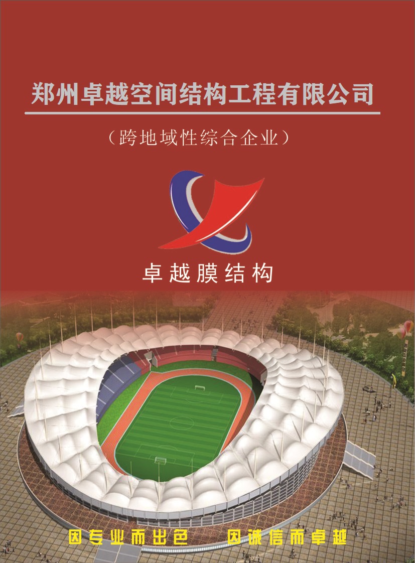鄭州卓越空間結(jié)構(gòu)工程有限公司是一家專業(yè)從事大跨度膜結(jié)構(gòu)技術(shù)開發(fā)、設(shè)計(jì)、加工、安裝、維護(hù)的大型膜結(jié)構(gòu)企業(yè)。是集膜結(jié)構(gòu)項(xiàng)目規(guī)劃、方案設(shè)計(jì)、結(jié)構(gòu)設(shè)計(jì)、靜動力學(xué)計(jì)算分析、鋼膜工程預(yù)算、鋼膜加工、整體結(jié)構(gòu)安裝以及使用維護(hù)于一體的綜合性工程公司。